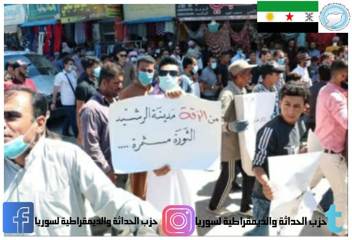 جانب من مشاركة الزملاء في المظاهرة التي خرجت يوم أمس السبت 15تموز/أغسطس 2020،في مدينة الرقة، ضد النظام السوري والمليشيات الموالية له، داعين للوحدة الوطنية و الانسجام المجتمعي و رفضا للفتنة الطائفية و العشائرية . #حزبالحداثةوالديمقراطية_لسوريا 16 -8 2020
