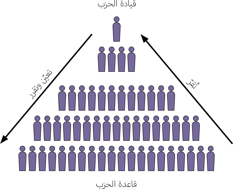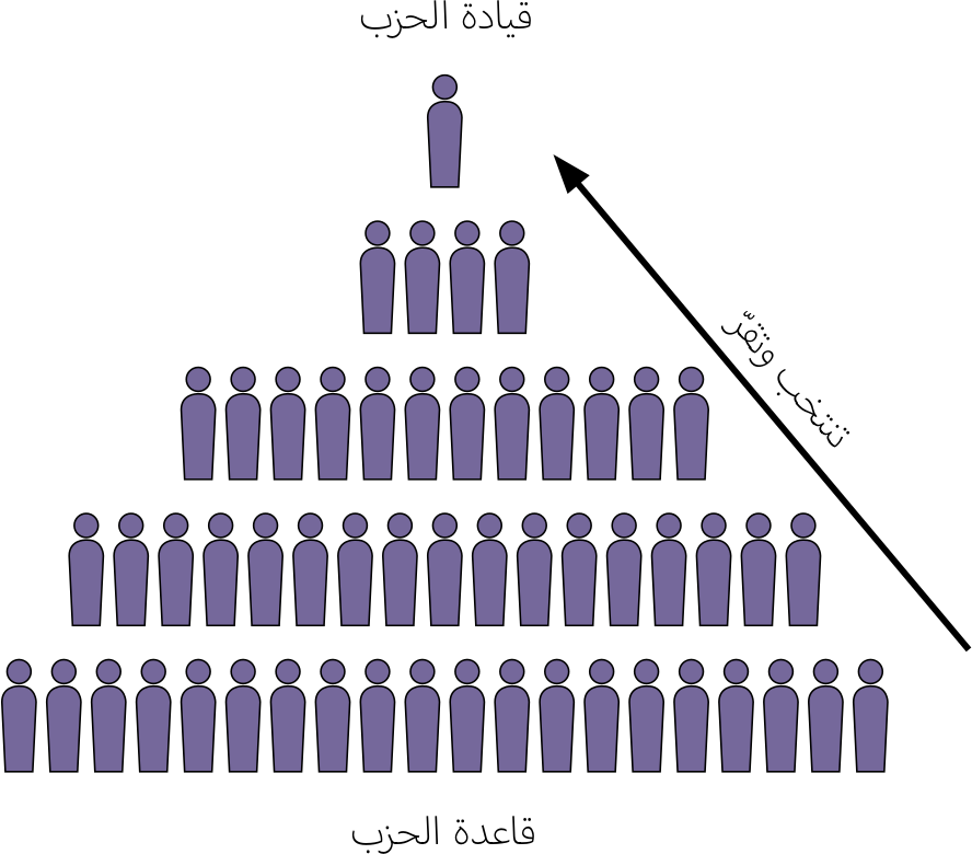 خلافاً لما سبق، سيُستعرض في الآتي نموذج حزبي بتنظيم ديمقراطي، حيث يكون أعضاء الحزب هم الفاعلين الأساسيين بدلاً من قيادة الحزب.
