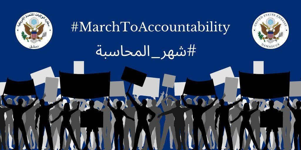 في تطور جديد وصل الملف السوري من واشنطن، أعلنت السفارة الأميركية في دمشق، عبر مواقع التواصل الاجتماعي، أن شهر آذار/مارس سيكون شهر محاسبة لحكومة دمشق، مشجعة السوريين على المشاركة من خلال هاشتاغ “#شهر_المحاسبة”.